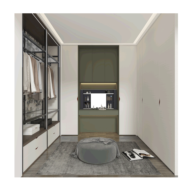 This elegant **closet** is a beautifully designed space that blends high-end style with practical storage solutions. The custom-built cabinetry features a clean, two-toned design with white panels and a central vanity area in a muted green finish. An open wardrobe with a dark frame and a decorative back wall creates a stylish display for clothing. The integrated mirror and lighting in the vanity area make it a functional and beautiful space for getting ready.