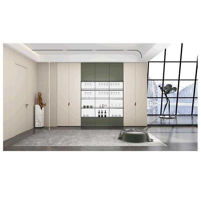 This contemporary **dining room** is anchored by a stylish and functional wall unit. The custom-built cabinetry, in a sophisticated two-toned design, features light off-white panels and a central bar area in a muted green finish. The lit display section provides a beautiful space to showcase glassware and wine bottles. The room is decorated with minimalist furniture and unique sculptures, while a large window with a black grid frame offers a stunning view, making the space feel open and serene.