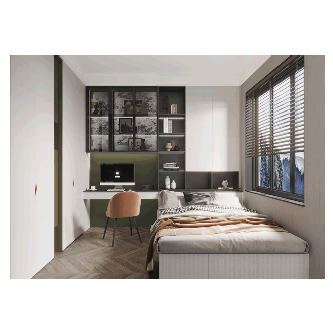 This modern **tatami** room is a masterful example of a multi-functional design that integrates a bedroom and a home office. The custom-built cabinetry creates a seamless and highly efficient living area. The low-profile platform bed features built-in drawers, maximizing storage. The space also includes a dedicated workspace with a sleek desktop and an artistic, glass-fronted cabinet for books and decor. The room’s minimalist design is complemented by the warm wood floor and a large window that frames a beautiful view.
