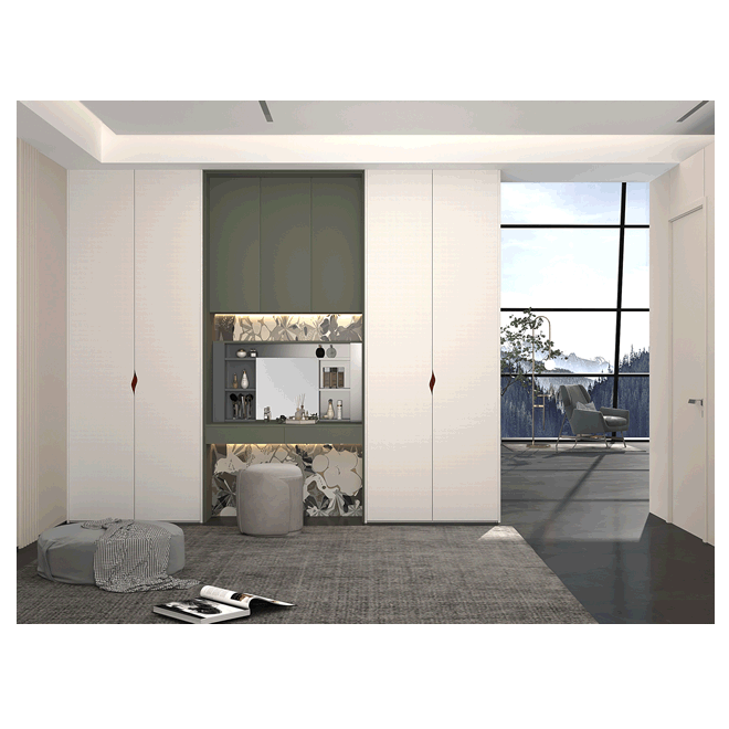 This modern **wardrobe** is seamlessly integrated into a chic and serene bedroom. The custom-built cabinetry features a two-toned design with textured white panels and a central section in a calming, muted green. This central area serves as a vanity with a built-in mirror and integrated lighting. The wardrobe offers a large amount of storage, while the mix of textures and colors creates a high-end, contemporary look. The design is a perfect example of a functional wardrobe that also serves as a beautiful centrepiece for the room.