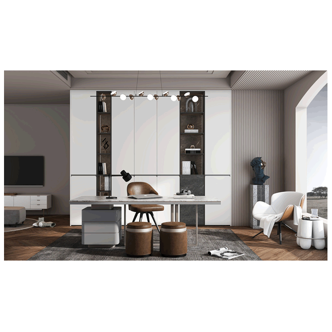 This elegant **bookshelf** is part of a custom-built unit in a modern office. The design features open shelving with dark interiors and integrated lighting, flanked by sleek white cabinet doors. This unit provides a beautiful backdrop for a large marble desk, combining work and storage in one seamless design.