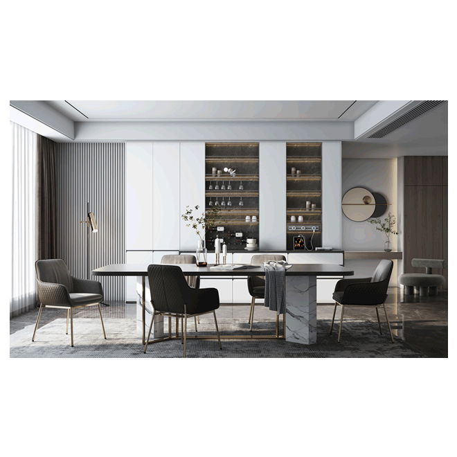 This modern **dining room** is anchored by a sleek wall unit that doubles as a bar. The custom cabinet features glass-fronted sections with a dark, textured interior to beautifully display glassware. A minimalist dining table with a marble base and upholstered chairs completes the sophisticated and organized space.