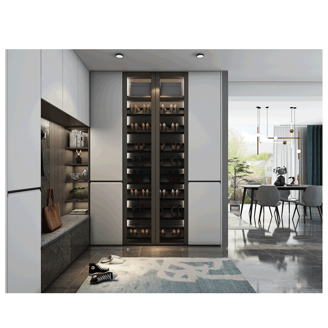 This modern **entrance** features a custom-built storage unit that is both functional and stylish. The cabinet combines sleek white doors with a central glass-fronted shoe display. An open bench and shelves to the side provide a practical space for sitting and storing everyday items.