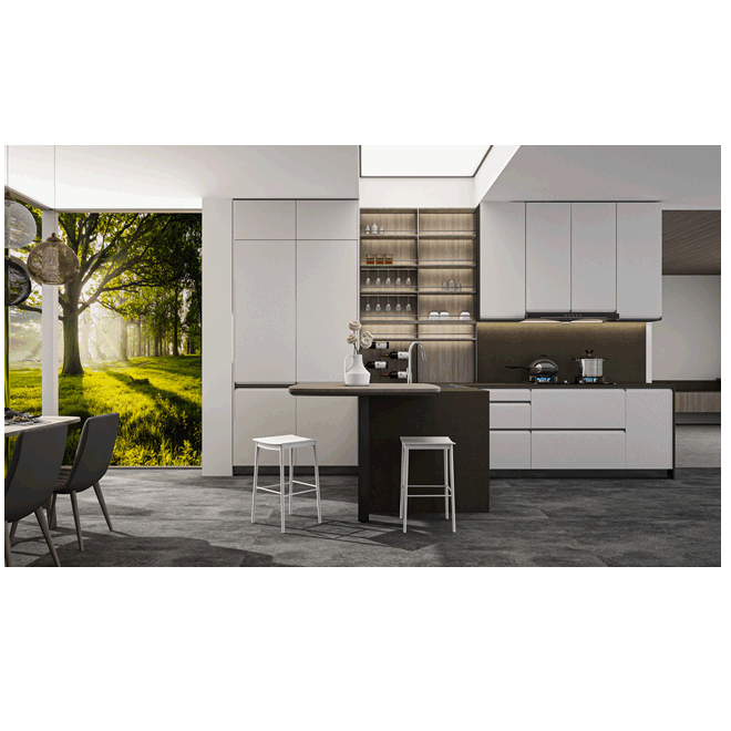 This minimalist **kitchen** features a custom-built cabinetry system with a light, textured finish. A modern island with a dark base and a light bar top anchors the space, while an open shelving unit provides a stylish display for glassware. The room’s design is highly functional and open to a beautiful outdoor view.