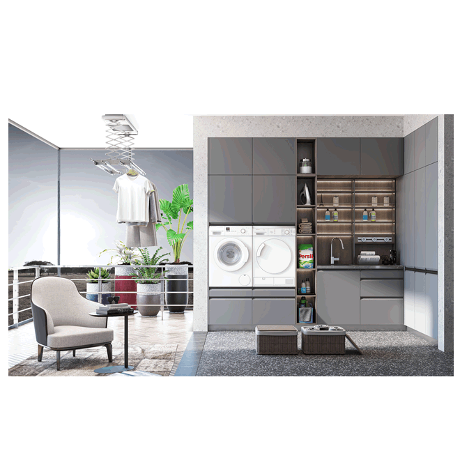 This highly functional **utility room** is designed with a sleek, minimalist style. The custom gray cabinetry integrates a stacked washer and dryer, a sink, and lit shelves for storage. A retractable drying rack on the ceiling maximizes the use of space.