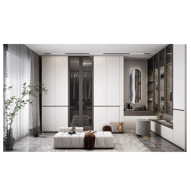 This modern **walk-in closet** combines functionality with luxury. The custom-built cabinetry features a minimalist white finish and a central section with elegant, reeded glass doors. The space includes a stylish vanity with a lighted mirror and a central upholstered bench, creating a sophisticated and highly organized dressing room.