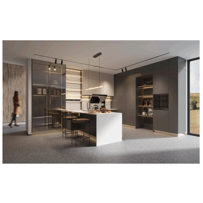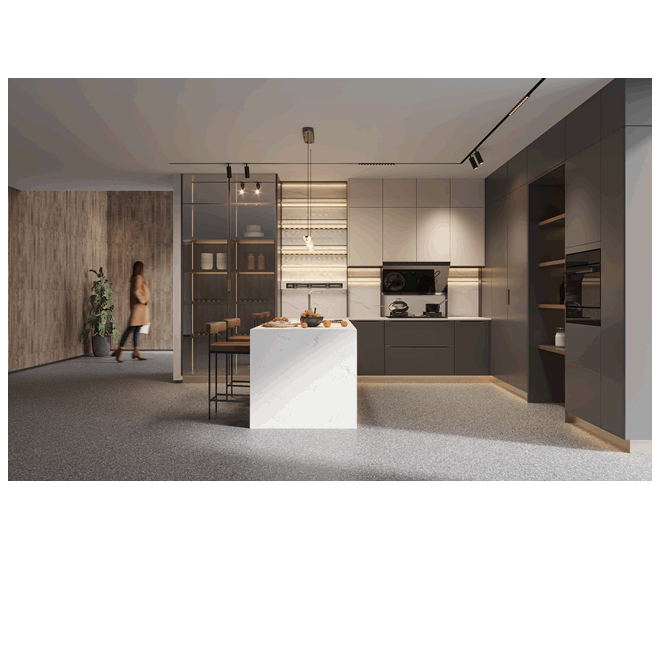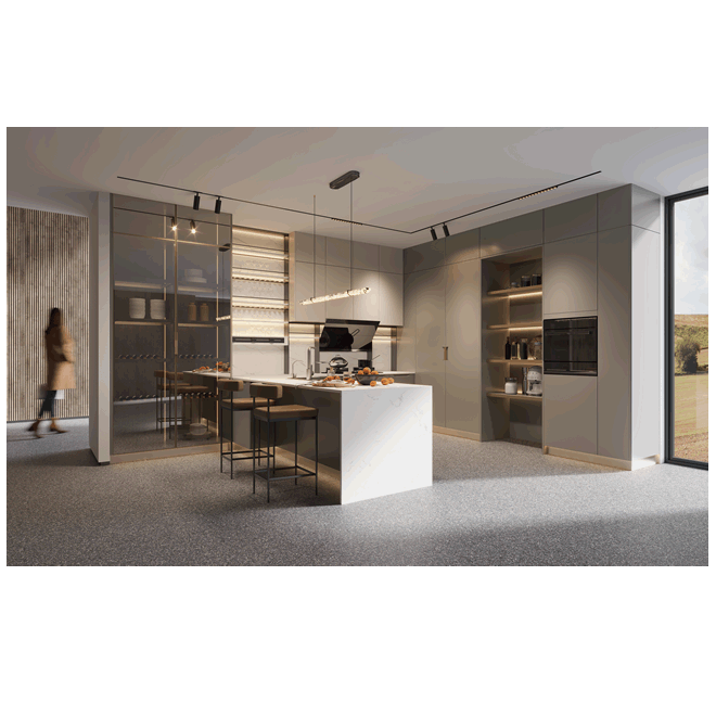 Enquire NowThis modern **kitchen** showcases a two-toned cabinetry system with dark gray and light beige finishes. A central island with a waterfall marble countertop and a glass-fronted display cabinet add a touch of luxury. The sleek design and integrated lighting create a sophisticated and highly organized cooking space.