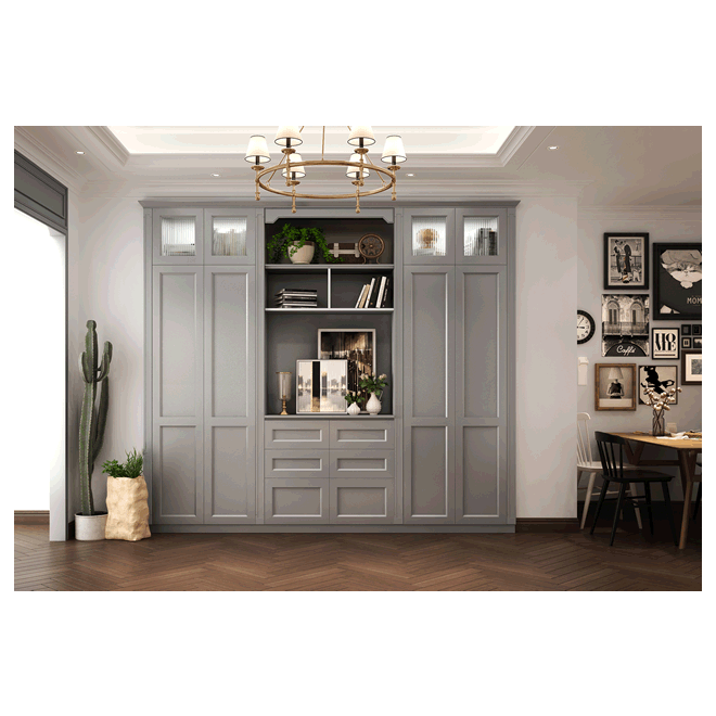 Elevate your home with this stunning built-in **bookcase**, a masterpiece of style and smart design. Its sophisticated gray finish and elegant panelling create a timeless centrepiece that anchors any room. With a perfect blend of open display shelves and discreet storage, it offers both a place to showcase your treasures and keep your space beautifully organized. It’s the ultimate statement of luxury and functionality, transforming your living area into a sanctuary of style.