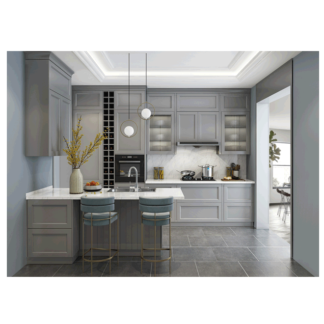 Discover timeless elegance with this sophisticated gray **kitchen**, where classic design meets modern functionality. The stunning panelled cabinetry provides abundant storage, while the luxurious marble countertops and backsplash create a polished, bright focal point. The central island with its chic seating offers the perfect spot for casual dining and conversation, making this space the true heart of the home. It’s a sanctuary of style, designed for both passionate cooks and those who love to entertain.