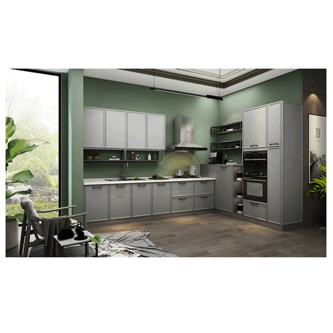 Unleash your inner chef in this bold and beautifully modern **kitchen**. Its sleek gray cabinetry creates a sophisticated foundation, while the refreshing sage green walls and expansive window view forge a harmonious connection with nature. With its clever combination of closed storage, open shelving, and state-of-the-art integrated appliances, this kitchen is designed for effortless style and exceptional functionality, making every moment in it a pleasure.