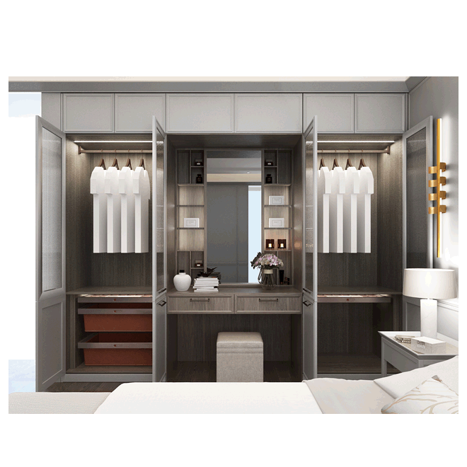 Transform your daily routine into a luxurious ritual with this custom-designed **wardrobe** system. This isn’t just storage—it’s a personal sanctuary, featuring a beautifully integrated vanity with a mirror and dedicated shelving. The smart, modular design offers a perfect blend of illuminated hanging space and convenient pull-out drawers, all hidden behind sleek doors. Effortlessly organized and impeccably styled, this wardrobe is the ultimate statement in refined living.