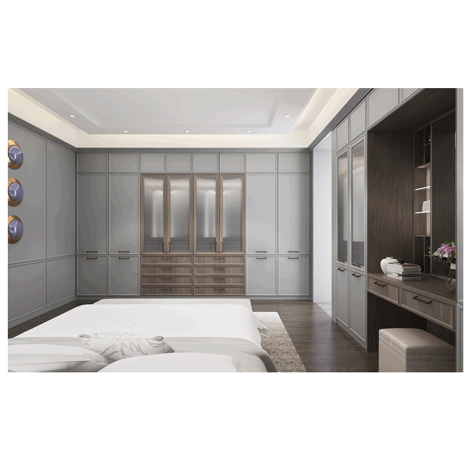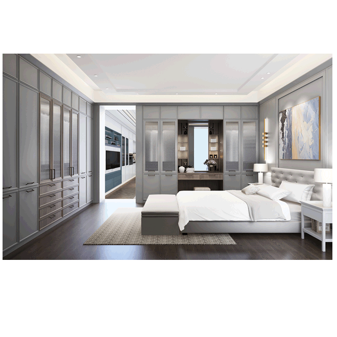 Discover the ultimate in bespoke luxury with this unparalleled, full-wall **wardrobe** system. This comprehensive design transforms your entire bedroom into a personal dressing sanctuary, seamlessly blending ample hanging space and elegant drawer storage. The refined gray finish and beautifully textured glass doors create a sophisticated aesthetic that is as organized as it is stunning, offering a truly custom solution for a life of effortless style.