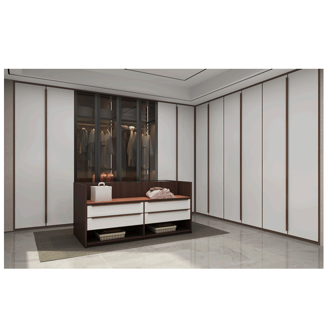 Transform your daily routine with this sophisticated **closet**, a perfect fusion of minimalist design and tailored function. The sleek, two-toned cabinetry creates a seamless and elegant backdrop, while the beautifully integrated central bench offers a space for effortless dressing. With its striking glass-front display and intelligent storage solutions, this bespoke sanctuary is designed for impeccable organization and serene style.