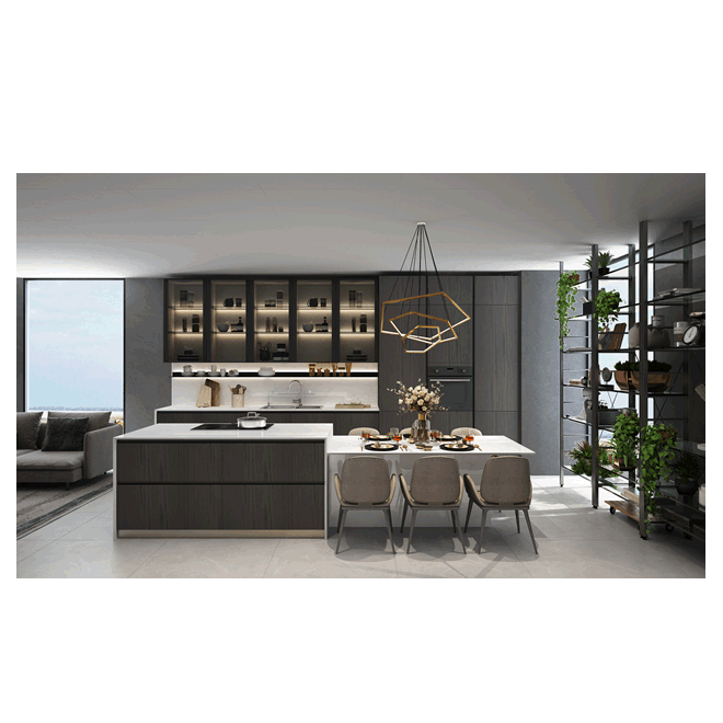 Discover the exquisite beauty of this contemporary **kitchen**, where a flawless fusion of form and function creates a culinary masterpiece. The bespoke dark wood cabinetry provides a sophisticated backdrop for the stunning, light-toned island with its elegant waterfall edge. It’s a space designed for effortless luxury, where every detail is a testament to refined living and high-end style.