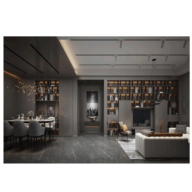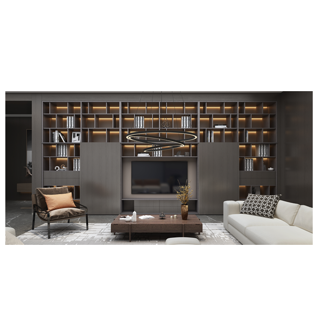 Enter a sanctuary of modern elegance in this beautiful **living room**. The bespoke dark wood cabinet, with its striking mix of open display shelves and discreet storage, offers a sophisticated solution for both design and function. Perfectly complemented by the serene outdoor view, this space is an invitation to relax in style and quiet contemplation.