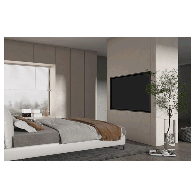 Transform your bedroom into a sanctuary of refined style and modern serenity. The sleek, freestanding TV unit and elegant bed with a plush, low-profile frame define the space, while a minimalist color palette and abundant natural light create an open and tranquil atmosphere. This design masterfully blends form and function for a truly classy and luxurious living experience.
