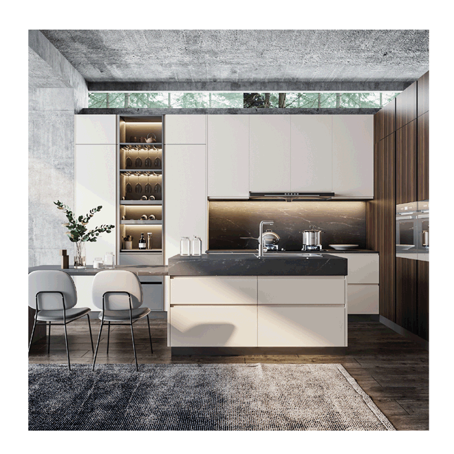 Discover a truly classy kitchen where style and function blend seamlessly. The bold design features a stunning marbled backsplash and a refined color palette of dark gray and rich wood tones. With integrated appliances and a beautifully lit wine rack, every detail is crafted for a luxurious experience.