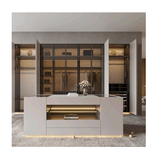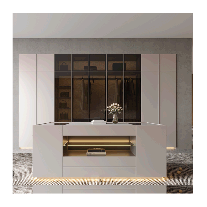 Experience streamlined elegance with this beautifully designed **wardrobe + island**. The expansive, built-in system features a striking combination of light, matte doors and transparent, smoke-gray glass doors. The interior is well-lit, providing a sleek, gallery-like display for your wardrobe, while the clever design maximizes floor space for an open and airy feel.