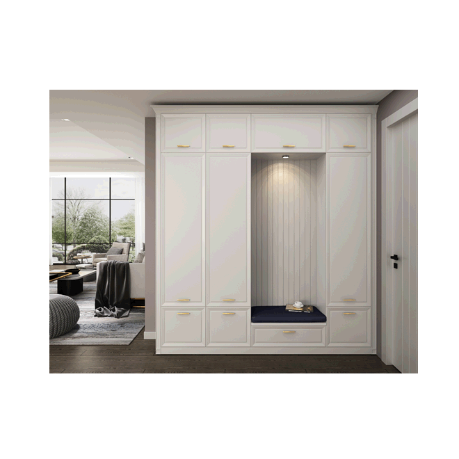 Welcome guests with this stylish and highly functional **hallway**. The custom-built cabinet system, in a classic off-white color with gold handles, provides extensive storage for the entire family. A central, recessed nook with a built-in bench and a plush blue cushion offers a convenient seating area. The elegant design is a perfect blend of timeless style and modern-day needs, ensuring a clutter-free and welcoming entrance.