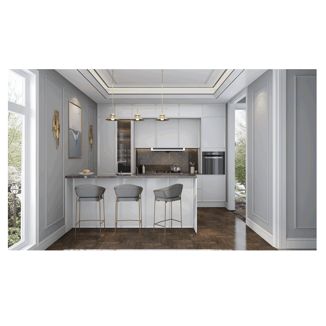 This elegant **kitchen** combines timeless classic style with modern functionality. The all-white cabinetry with intricate moulding details creates a clean and sophisticated look, beautifully contrasted by a dark, marbled backsplash and countertop. The central island provides a functional workspace and a comfortable bar-style seating area with stylish gray stools. Gold accents throughout the room add a touch of luxury, from the light fixture to the chair legs.