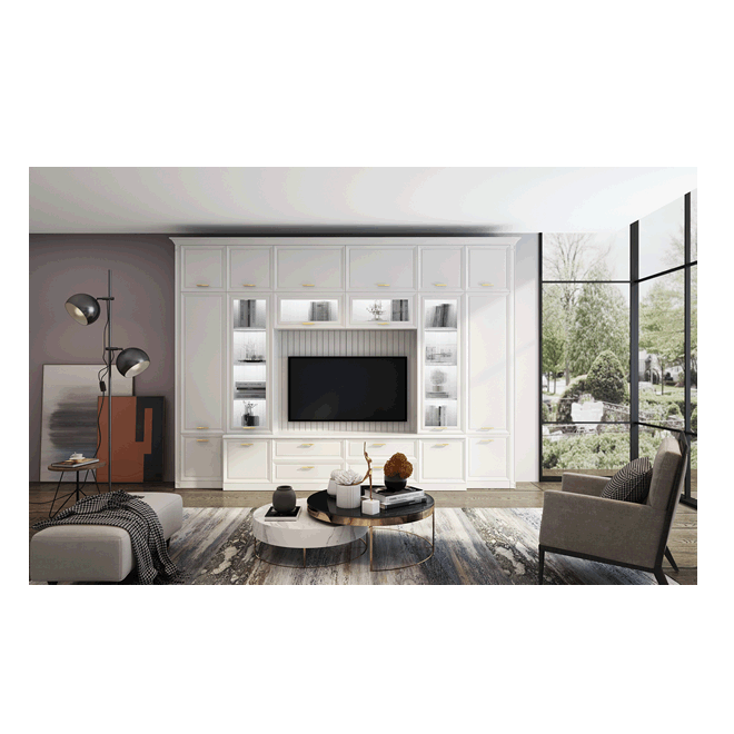 This elegant **living room** seamlessly blends timeless classic design with modern comfort. The focal point is a grand, custom-built entertainment unit featuring a clean off-white finish, intricate moulding, and elegant gold handles. The central TV area is framed by beautifully lit display shelves with a textured back wall, providing a perfect home for your curated collection. The large window wall floods the room with natural light and offers a stunning view of the outdoors.