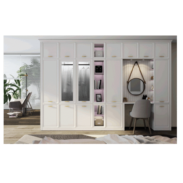 This elegant **wardrobe** is a perfect blend of timeless style and practical design. The large, custom-built system features a classic off-white finish with decorative molding and elegant gold handles. A central section includes transparent, fluted glass doors, creating a beautiful display area with a soft pink interior. A built-in vanity with a mirror and integrated lighting makes getting ready a luxurious experience, while the surrounding cabinets and drawers provide ample storage
