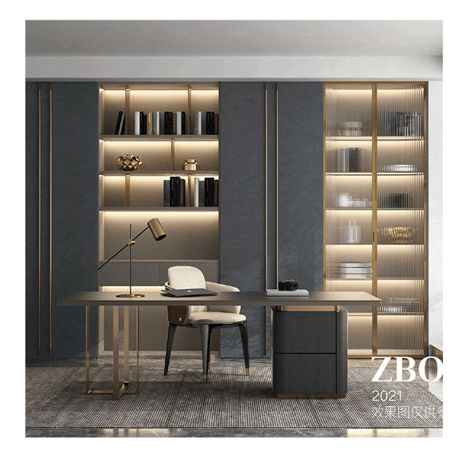 Elevate your study with this statement-making bookcase. The striking design features a bold, dark finish complemented by elegant gold accents and a mix of open and closed display sections. With sophisticated, ribbed glass doors and integrated lighting, this unit is a perfect showcase for your collection—a masterful blend of form and function for the modern professional.