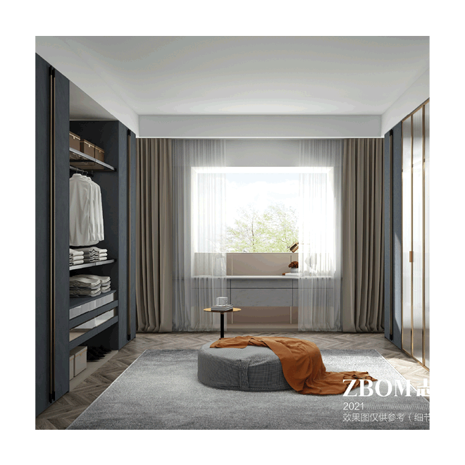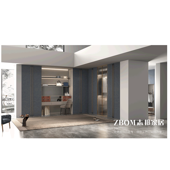 Experience the ultimate in bespoke storage with this elegant **L-type closet** system. The clever L-shaped design wraps around the corner, creating a beautifully integrated dressing area. The sleek, dark cabinetry with gold accents and a unique ribbed glass door creates a sophisticated display, while the integrated vanity and smart storage solutions make your daily routine effortless.
