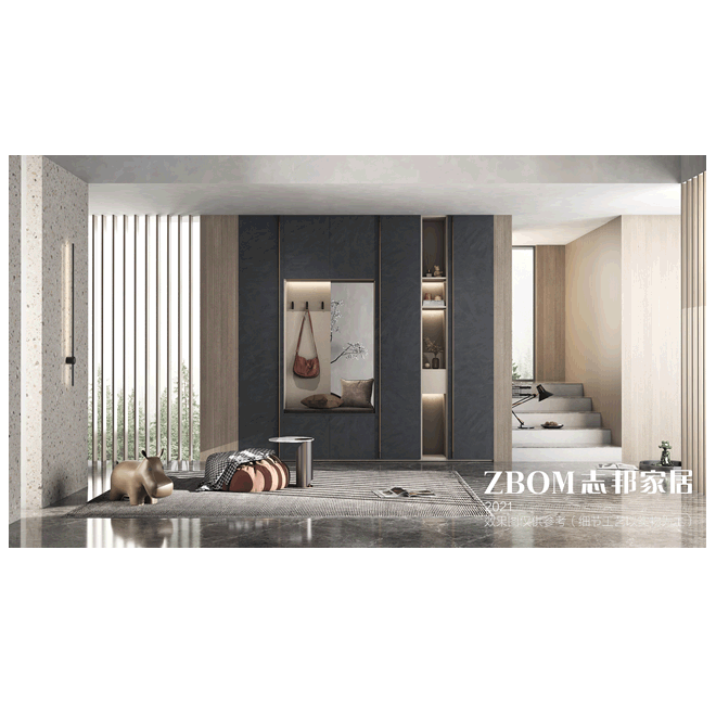 Make a dramatic first impression with this stunning entryway. The bold design features a dark, textured cabinetry with elegant gold accents and a clever, built-in niche for convenience and style. A beautiful blend of materials, from the dark floors to the warm wood slats, creates a sophisticated and welcoming transition into the home.