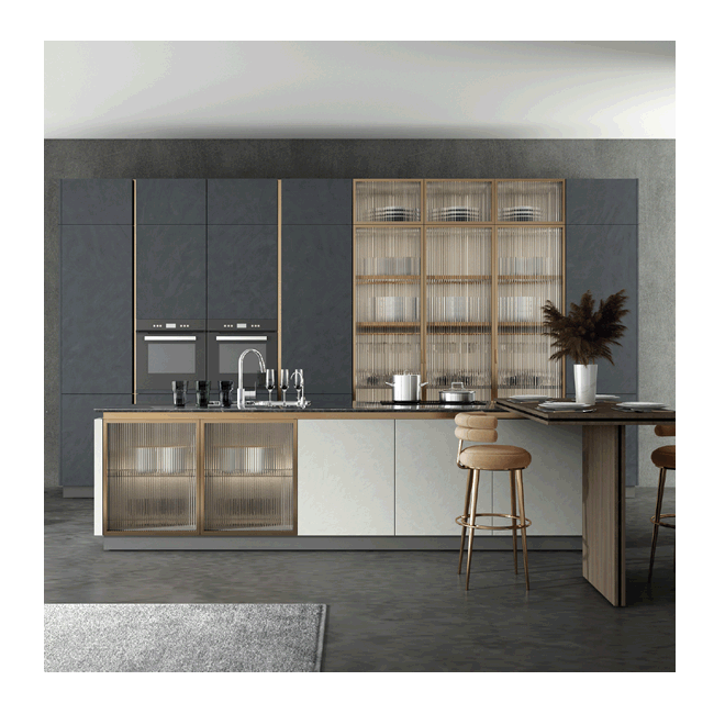 Discover a kitchen where bold design meets elegant functionality. The stunning blend of a dark, textured finish and the warmth of wood creates a sophisticated atmosphere. With unique, ribbed glass cabinetry and a spacious island, this kitchen is a testament to modern artistry and smart storage.