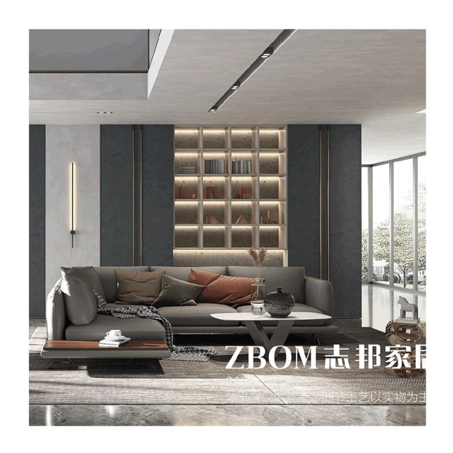 Discover a living room where bold design meets elegant comfort. The stunning blend of a dark, textured accent wall and elegant gold accents creates a sophisticated backdrop. A beautifully lit, grid-style bookcase provides a perfect display for your favorite items, while the plush, modern sofa invites you to relax in style.