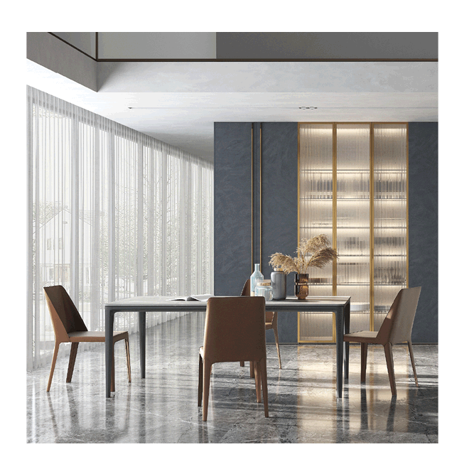 Experience an elevated dining experience in this masterfully designed dining room. The stunning textured wall and a unique blend of ribbed glass and gold accents create a sophisticated backdrop for any meal. With thoughtful lighting and a spacious layout, this room is perfect for both intimate dinners and grand entertaining.