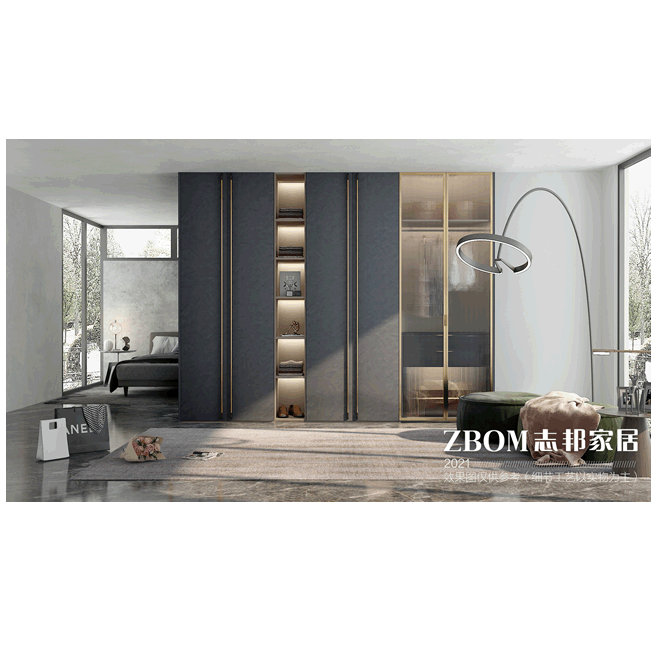 Experience the ultimate in wardrobe organization with this luxurious **double closet**. The design features a seamless blend of open and closed storage, with rich, textured finishes and elegant gold accents. The unique ribbed glass doors and integrated lighting create a stunning display, while the thoughtful layout provides a perfectly organized space.
