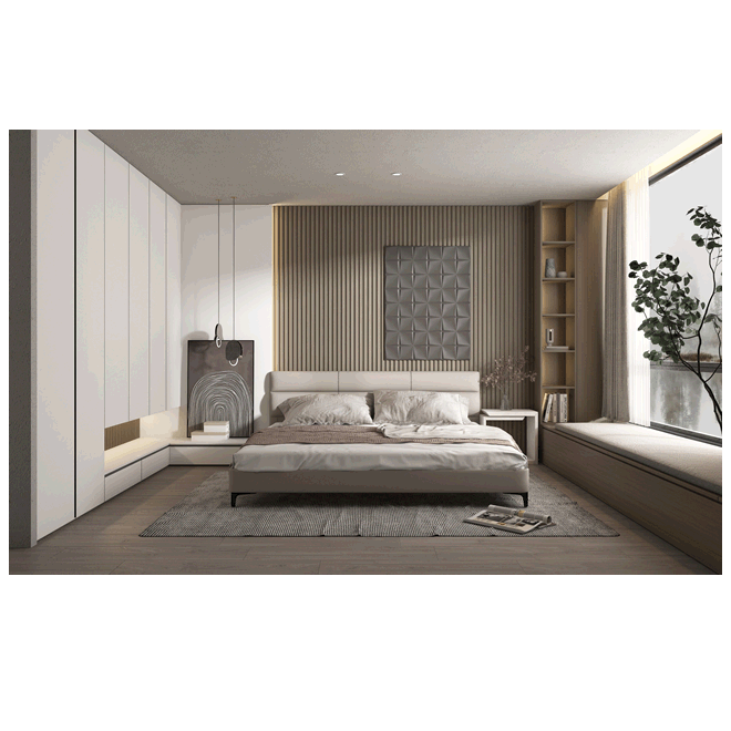 Step into a world of serene comfort with this beautifully designed **bedroom**. The clean, minimalist design is highlighted by a stunning slatted wall behind the bed and a full-height, handle less wardrobe. Thoughtfully placed shelves and a cozy window seat add both style and function, creating a space that feels calm and effortlessly modern.