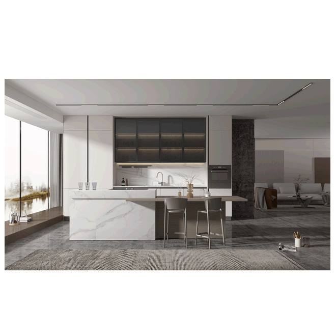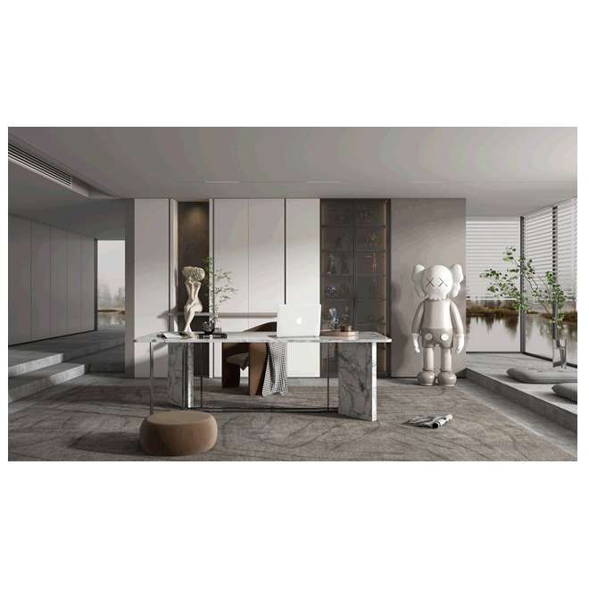 This modern workspace masterfully combines productivity with artful display. The long, elegant desk with a marble top is a beautiful focal point, complemented by a seamless, built-in cabinet system. The clever design features a display **bookcase** with glass doors and integrated lighting, perfect for showcasing your unique collection, while providing ample storage.