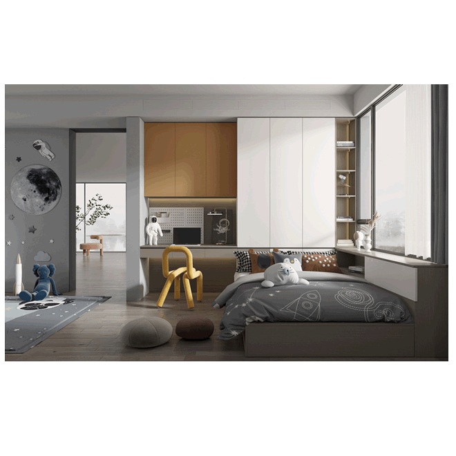Blast off into a world of imagination with this playful and practical **children’s room**. The space-themed design, complete with a creative wall mural and bedding, sets the tone for adventure. The built-in unit masterfully combines a bed, a study area with a pegboard, and plenty of smart storage, keeping the room tidy and organized.