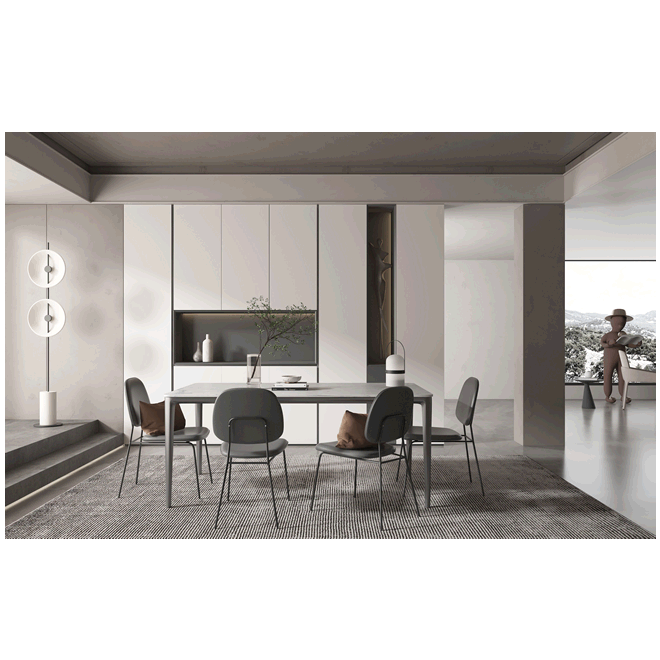 Discover a **dining room** where modern design and serene comfort come together. The clean, minimalist cabinetry and striking display niche create a sophisticated backdrop for any meal. With a spacious table and comfortable chairs, this room is perfect for both casual gatherings and formal entertaining.