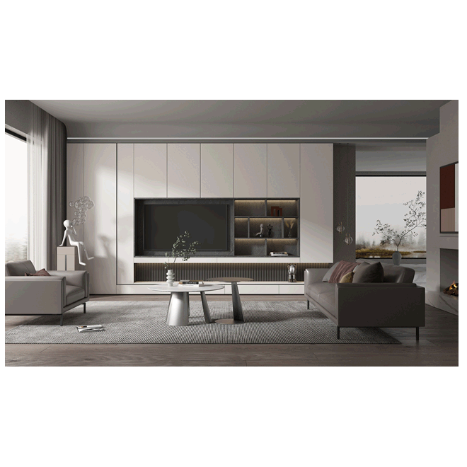 Discover a **living room** where sophisticated design creates an atmosphere of serene comfort. The clean, minimalist cabinetry and a beautifully lit, built-in TV wall create a striking focal point. With a harmonious blend of light and dark tones and an uncluttered layout, this space is perfect for both quiet evenings and entertaining guests.